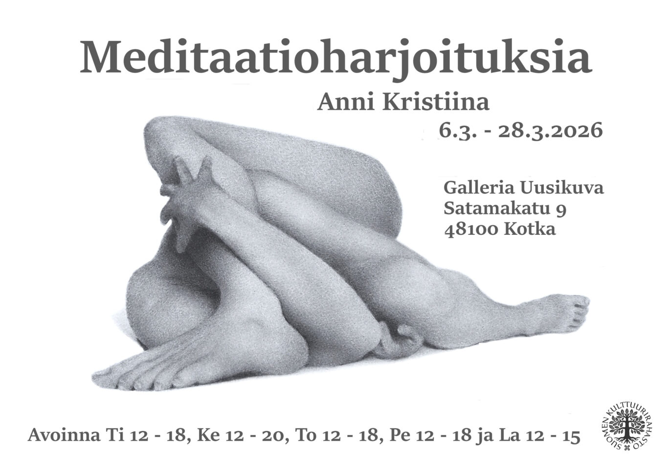 ”Anni Kristiinan näyttely Meditaatioharjoituksia, koostuu lyijykynäpiirustuksista, joissa on kuvattu ihmistä, ja ihmiskehoa. Näyttelyssä on esillä viime vuosien aikana valmistuneita, sekä uusia teoksia. Teoksissa realistinen ilmaisu yhdistyy hienovaraiseen symboliikkaan. Esittävää ilmaisua, ja näkyvää todellisuutta käytetään välineenä, jonka kautta käsitellään sisäistä maailmaa.